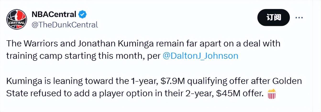 此外,勇士队还将失去库明加的“鸟权”(允许球队超工资帽续约的特殊权利);若库明加在本赛季结束后离队,勇士队不仅无法获得任何回报(要知道此前数年球队曾拒绝过多次关于库明加的交易报价),还可能因资质报价引发的争议,让他整个赛季都成为媒体关注的焦点,对球队氛围造成干扰。